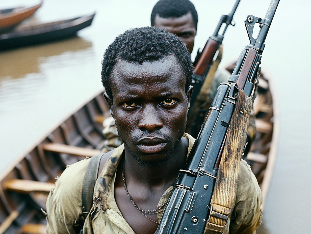 Portrait of two soldiers on riverside of River Congo