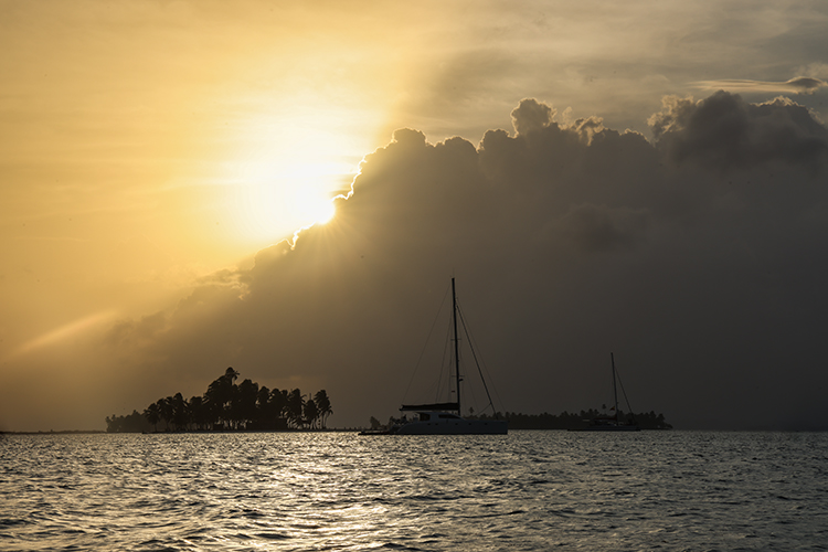 Sailboat in backlight of sunset at San Blas Island in Panama.